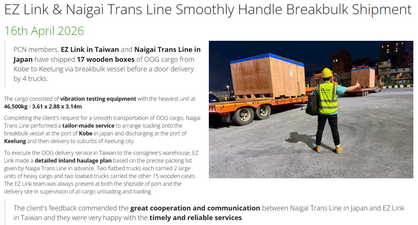 "PCN members, EZ Link in Taiwan and Naigai Trans Line in Japan have shipped 17 wooden boxes of OOG cargo from Kobe to Keelung via breakbulk vessel before a door delivery by 4 trucks."