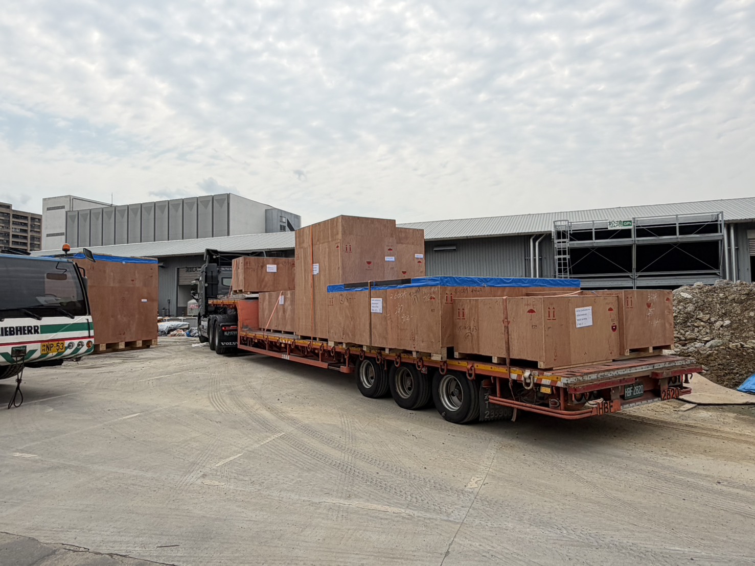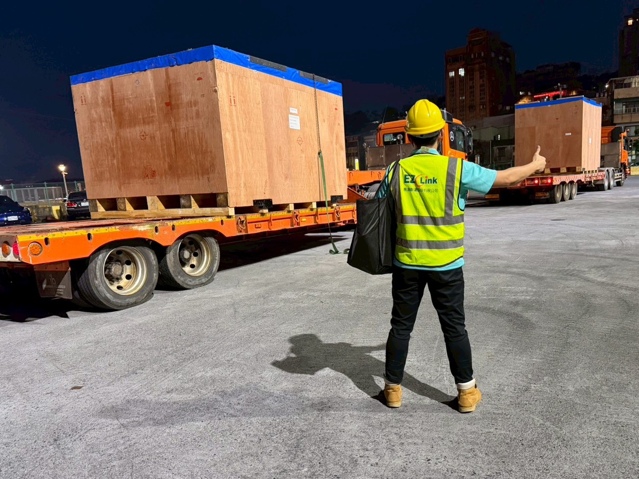 To execute the OOG delivery service in Taiwan to the consignee's warehouse, EZ Link made a detailed inland haulage plan based on the precise packing list given by Naigai Trans Line in advance. Two flatbed trucks each carried 2 large units of heavy cargo and two lowbed trucks carried the other 15 wooden cases. The EZ Link team was always present at both the shipside of port and the delivery site in supervision of all cargo unloading and loading.